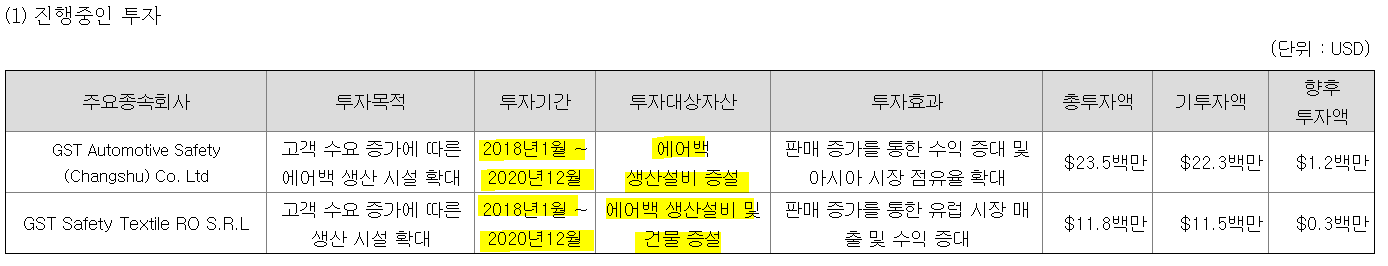 현재 진행중인 투자는 에어백 생산설비만 사업보고서에 보이네요.