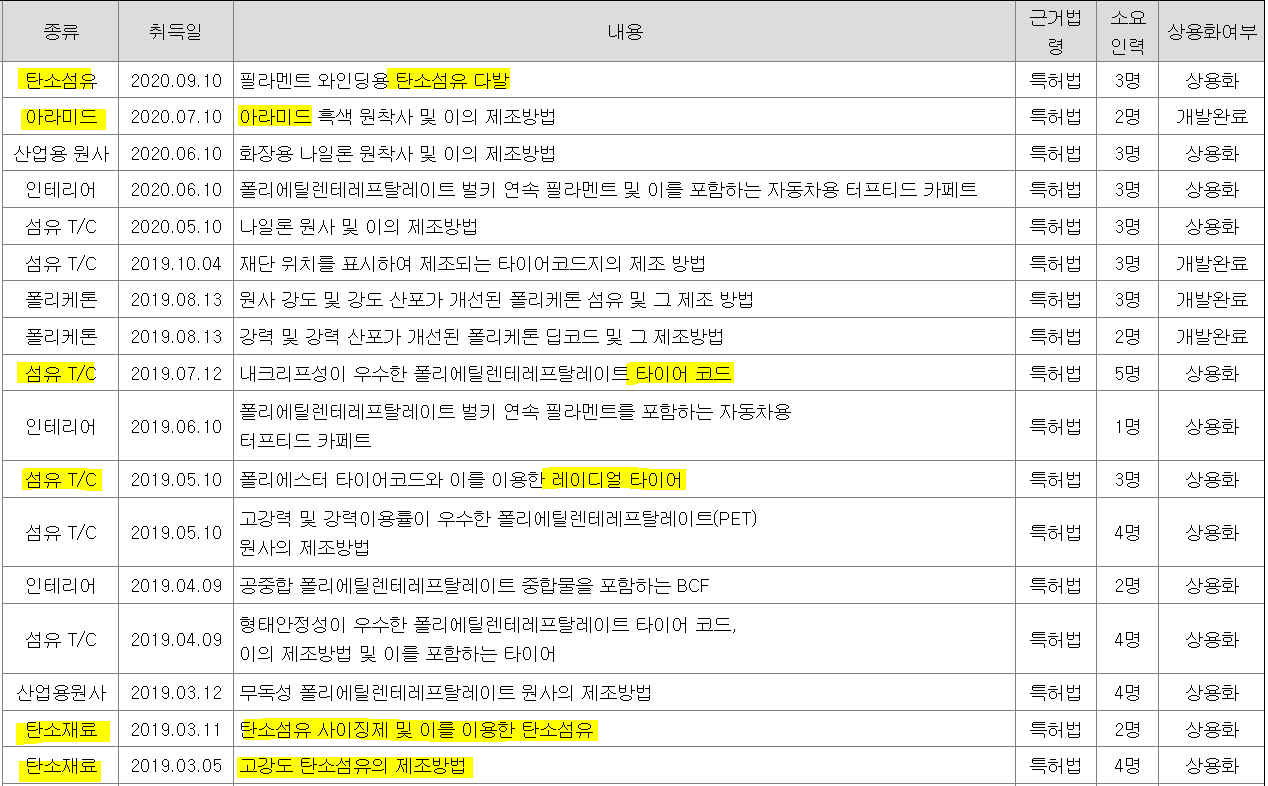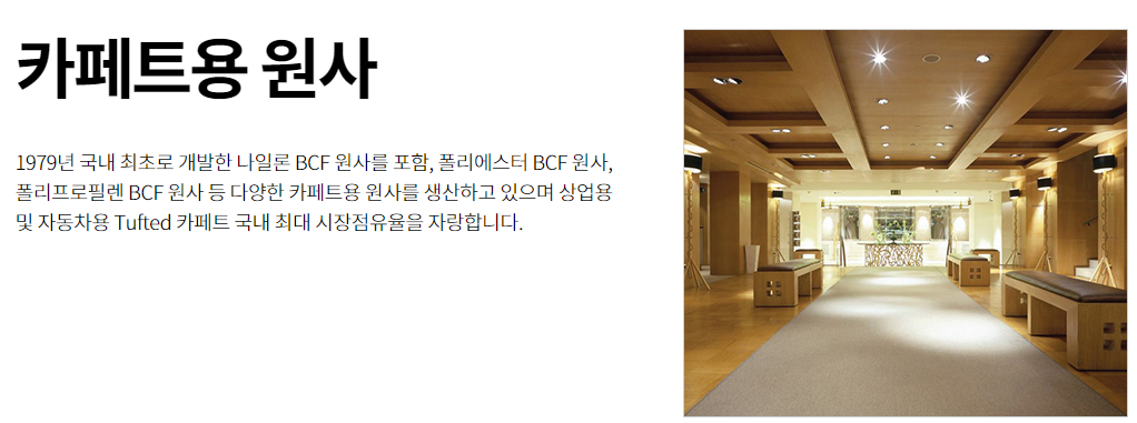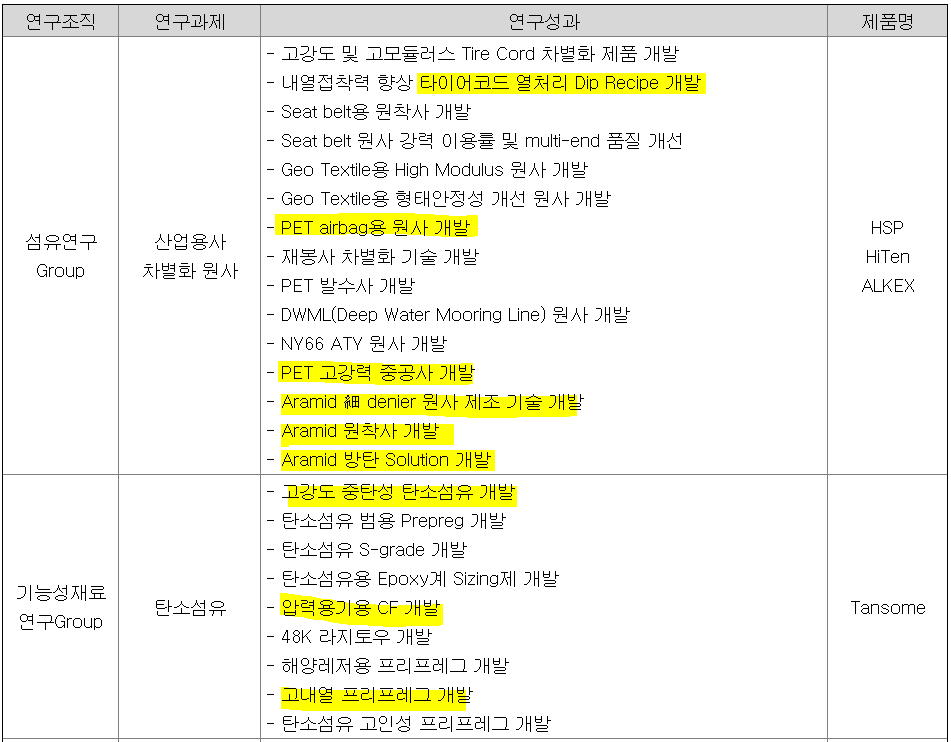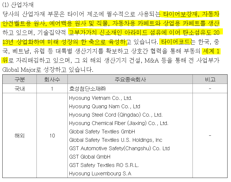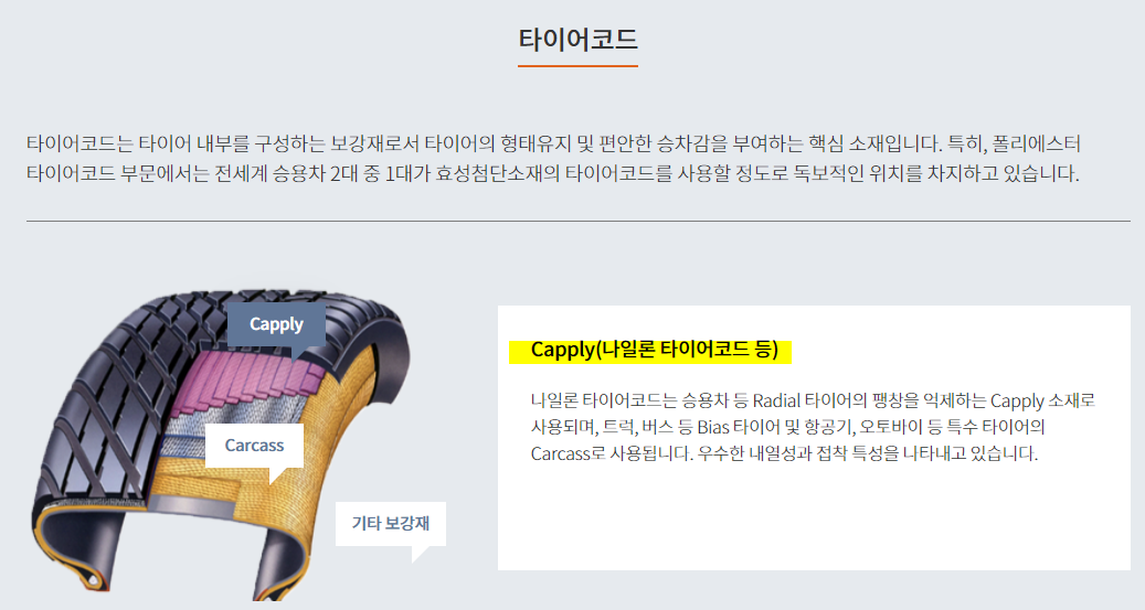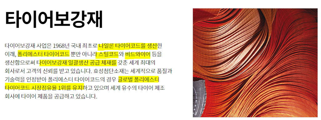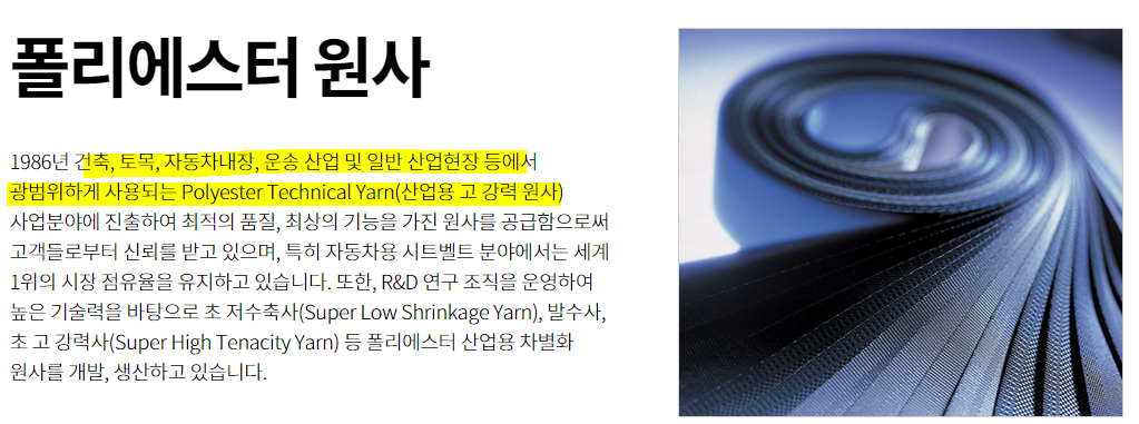 타이어코드는 점유율 세계 1등이고, 고부가가치 신소재인 아라미드 섬유와 탄소섬유를 개발하여 판매하고 있습니다.
