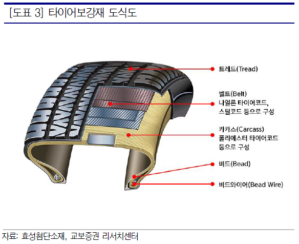 타이어보강재는 매출 비중 57%, 이익 비중 73%를 차지하고 있습니다.