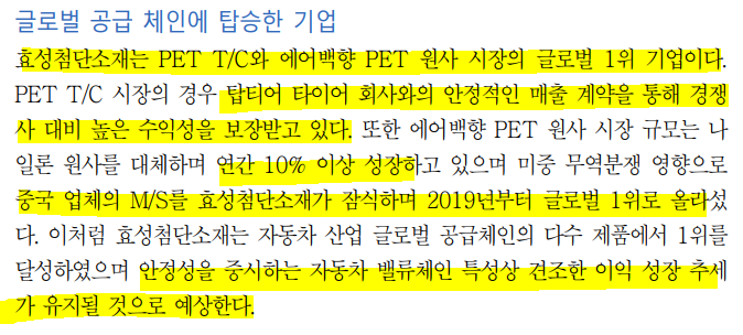 에어백향 PET원사는 효성첨단소재가 판매량 기준 세계1위입니다.