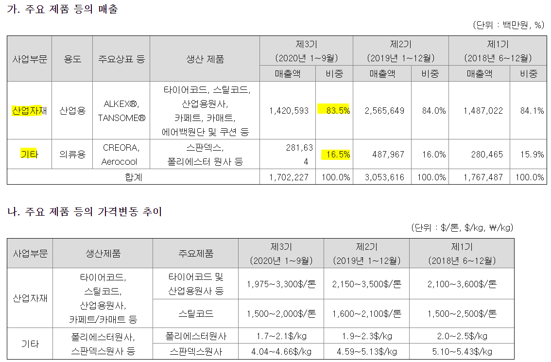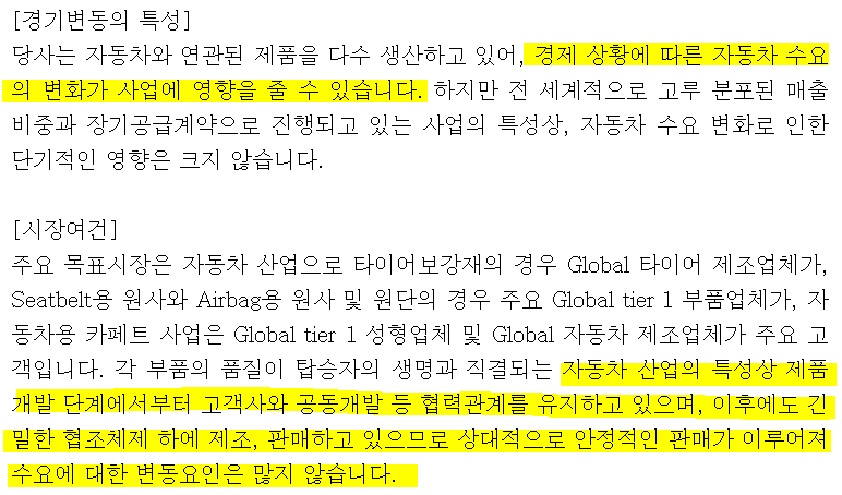 타이어코드나 에어백 경우 자동차 수요의 변화에 따라 매출변동이 발생할 수 있으며, 글로벌 Tier1 업체들과 긴밀한 협조체제를 이루고 있어서 안정적인 판매가 이루어지고 있습니다.