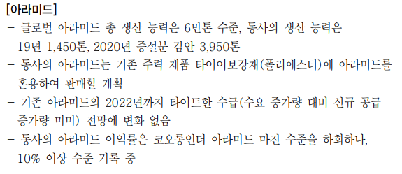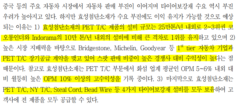 사업보고서 뿐만아니라 애널리포트에서도 동사의 타이어코드 부문은 견조한 이익 성장세를 예상하고 있습니다.