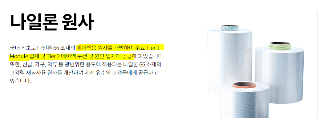 에어백용 원사를 개발하여 판매하고 있습니다.