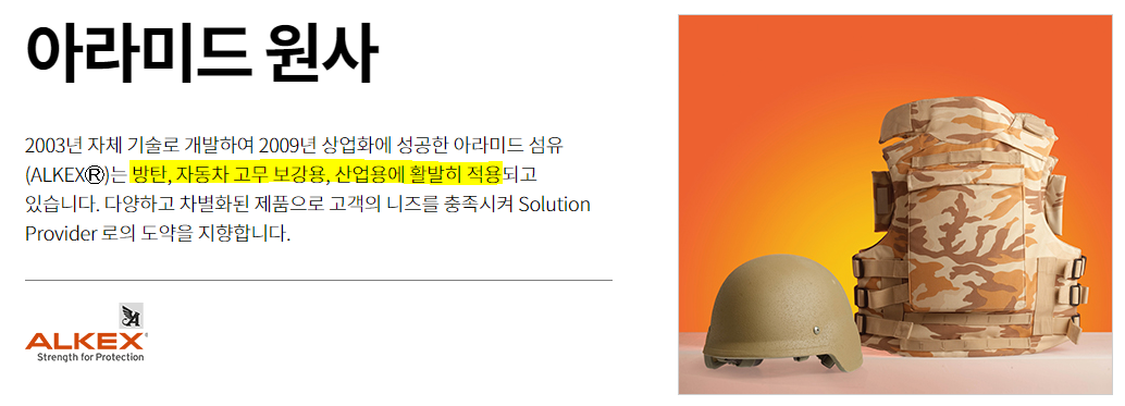 아라미드는 방탄, 타이어보강재등에 적용되는 첨단 소재입니다.