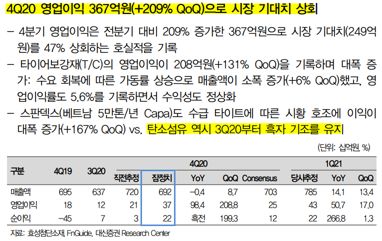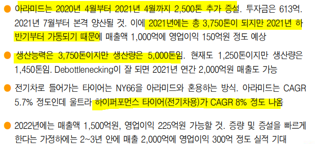 21년 당기순이익 1000억 가정하고, 타이어보강재 매출 증가, 아라미드와 탄소섬유 성장성을 믿는다면 현재 주가는 아주 비싼 상태는 아닐 수 있을 것 같네요..