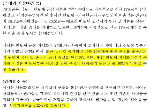 세정부문은 반도체 공정 미세화에 따른 세정의 중요성이 높아질 것으로 예측되며 경쟁력 강화를 위해 기술 개발중인것 같습니다.