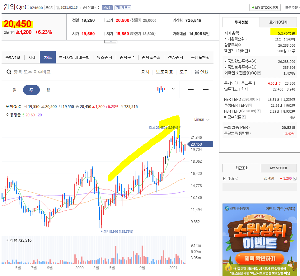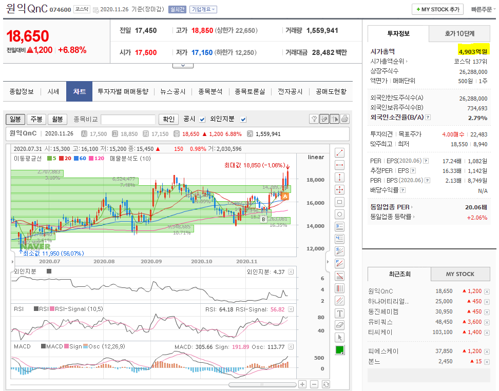 20년 8월 20일 원익QnC 주가는 13450원이었구요.