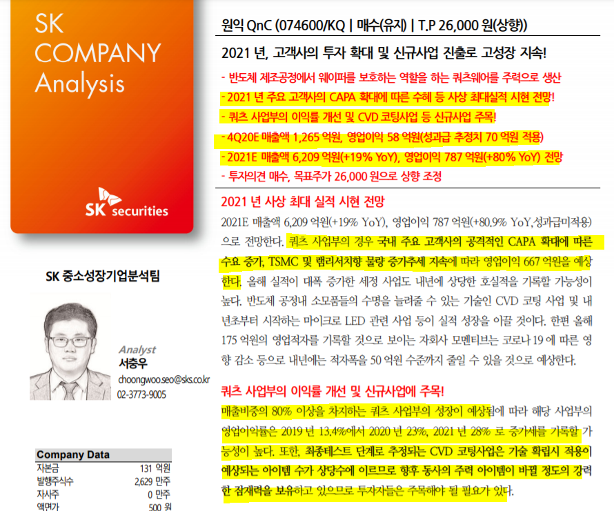 또한 쿼츠 제품은 반도체 핵심공정인 Diffusion, Etch 공정에서 쓰이고 반도체 공정 미세화에 따른 세정 수요도 증가할테니 21년 매출 증대가 기대됩니다.