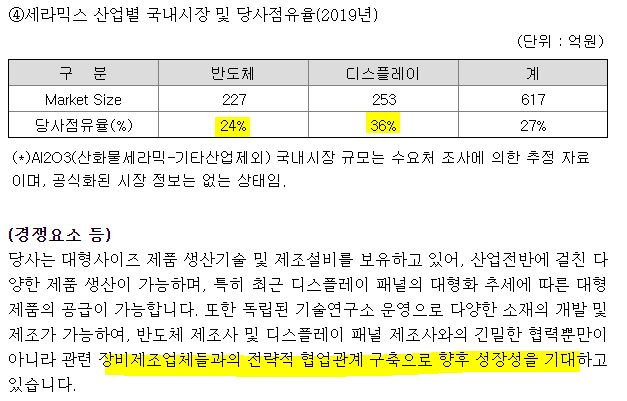 세라믹스 부문은 후발주자로 아직은 어려운 상태로 보이며, 국내 대형 거래처들의 국산화를 기대하고 있는 것 같습니다.