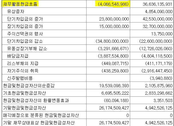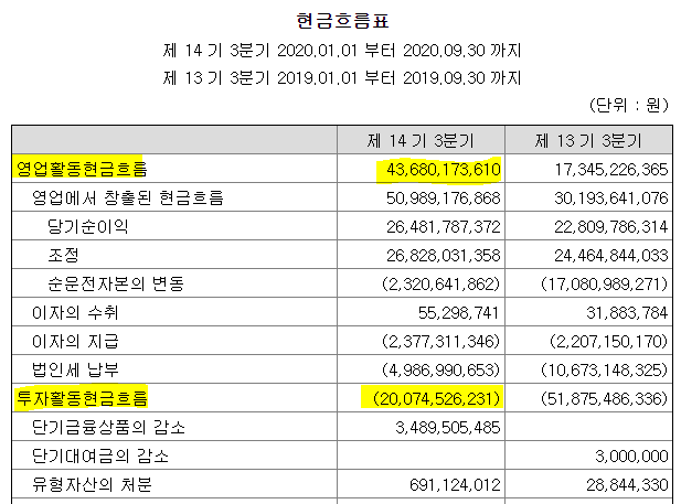 20년 3분기 영업활동 현금흐름(+), 투자활동 현금흐름(-), 재무활동 현금흐름(-)