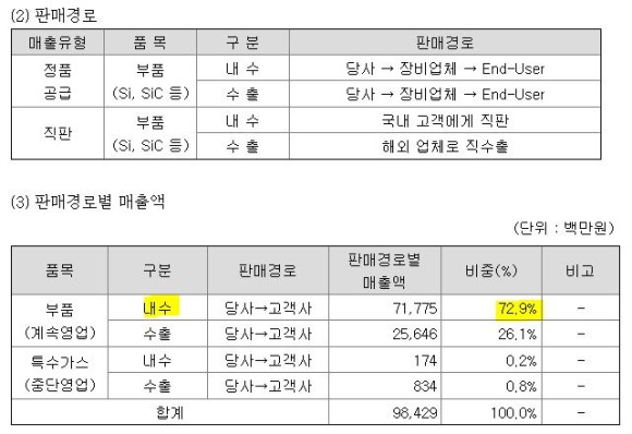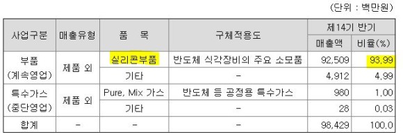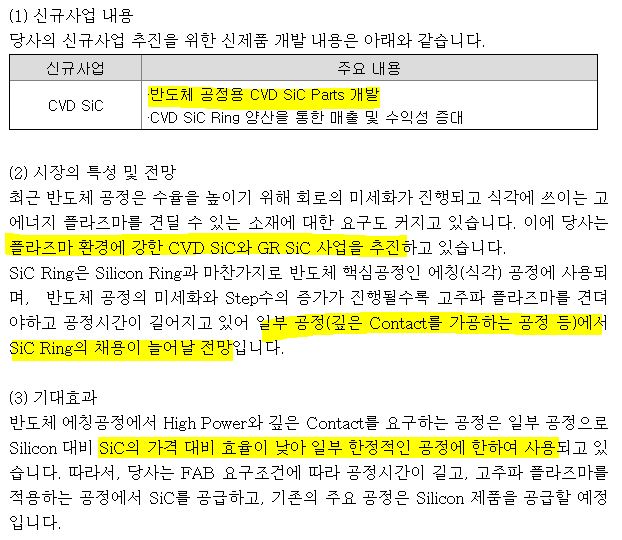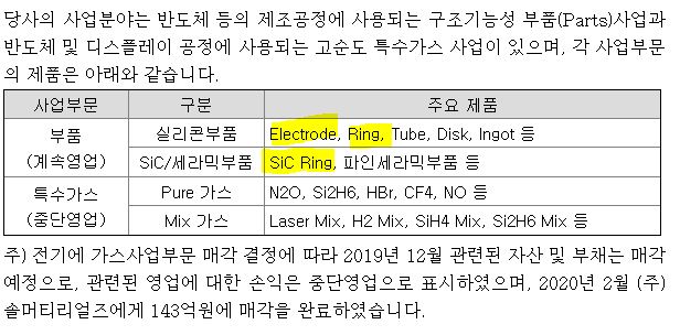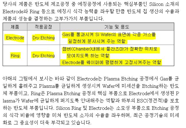 회사 홈페이지에는 SiC(Silicon Carbide) 부품(SiC Coating, SiC-CVD Bulk)만 나오는데, 사업보고서와 애널 리포트를 보면 SiC Ring을 만들어 삼성전자에 납품한 것으로 추정됩니다.