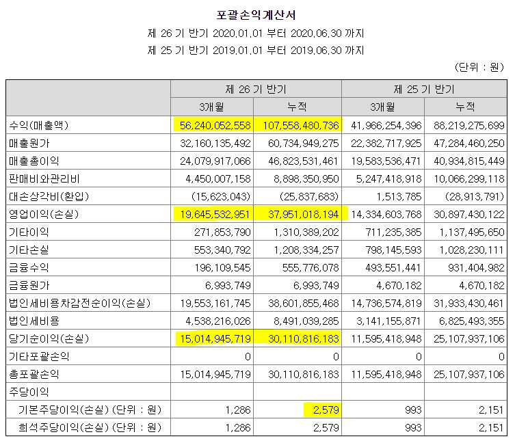 20년 반기 영업이익 241억으로 전기 대비 약 9% 증가