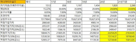 21년에 업데이트된 컨센서스 기준에 요구수익률 5% 가정하면 주가가 아직도 더 오를 여지가 있어 보이네요..