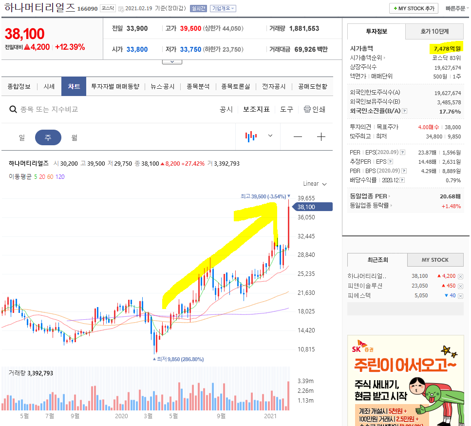 약 6개월 지난 21년 2월 19일 하나머티리얼즈 주가는 38100원입니다.