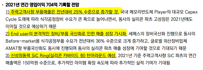 또한 향후 AMAT 장비로도 SiC Ring을 공급하며, TEL 이외로의 고객 다변화에 성공할 것으로 기대된다. '삼 성전자의 공격적인 NAND 증설'과 'SiC Ring의 공급량 확대'가 동반될 것으로 예상되는 2021년에도 사상 최대 실적 흐름이 지속될 것으로 전망한다.