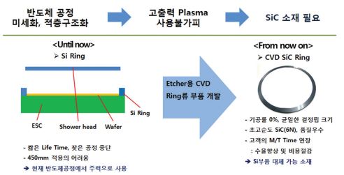 현재까지는 Si Ring이 잘 사용되어 왔지만, 플라즈마특성이 약해 lifetime이 짧다는 문제점과, 회로선폭을 보다 줄여야 하는 향후의 반도체 공정에서는 고출력의 RF(Radio Frequency) power 를 사용 해야 하는 환경에서 사용이 제한되어 신규 소재인 SiC Ring을 사용한다고 합니다. 동일한 플라즈마 환경에서 식각된 Si과 SiC의 식각정도를 봤을 때 최대 약 10배정도 까지 SiC의 내 플라즈마 특성이 우수하다고 합니다.