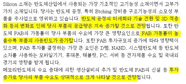 업계에서는 올해 샘플 테스트를 통과하고 시장 진입을 시작한 실리콘카바이드 사업이 신성장동력으로 성장할 수 있을지 주목하고 있다. D램의 선폭 미세화와 낸드플래시의 적층이 고도화될수록 고출력 플라즈마, 건식식각 제어의 필요성이 커지는데 실리콘카바이드는 실리콘 파츠에 비해 깊은 식각이 가능하고, 내구성이 우수한 특징이 있다. 국내 기업인 티씨케이가 글로벌 시장의 80%가량을 장악한 영역이다.