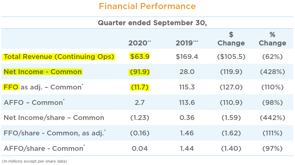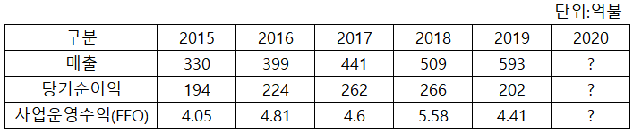 20년 3Q 실적을 보면 매출액은 전년대비 급감했고, 순이익은 적자, FFO도 적자입니다.