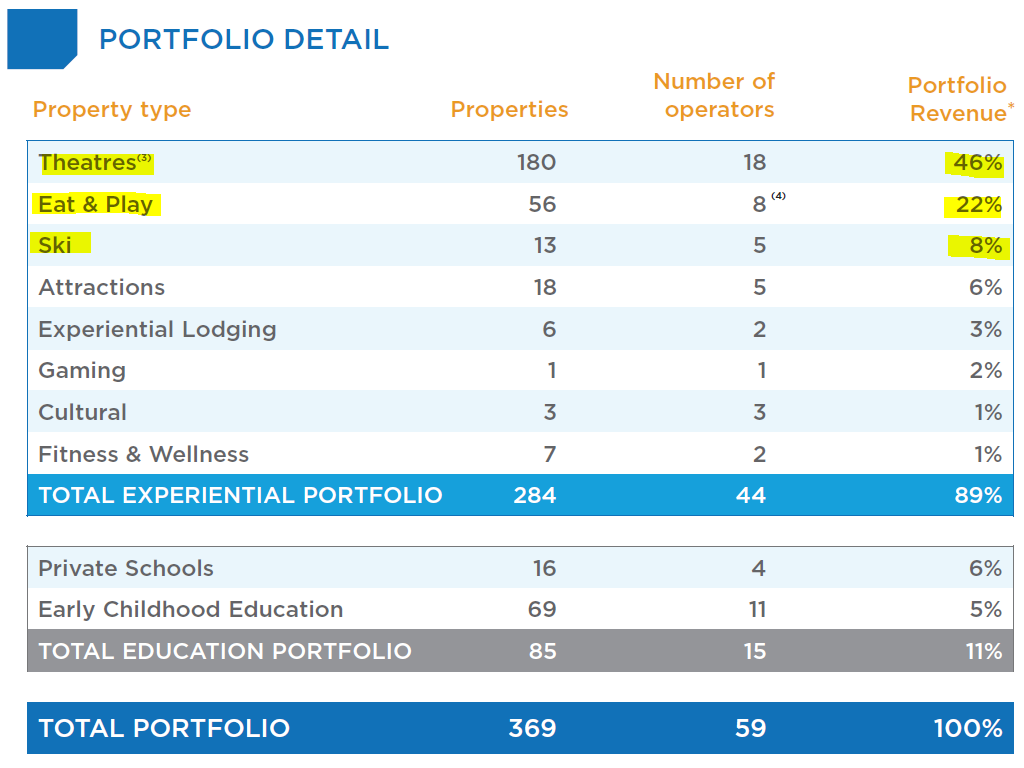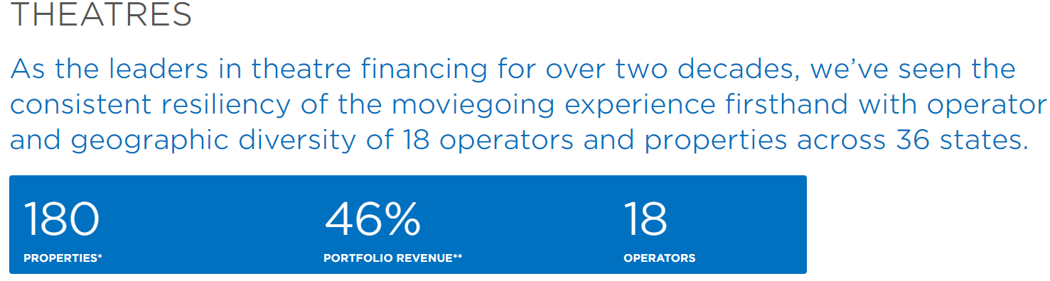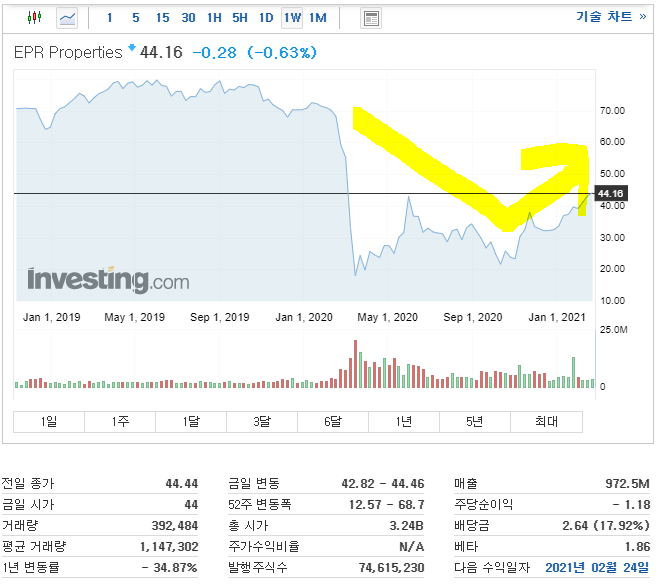 미국 전역에 있는 AMC, Regal 등의 멀티플렉스 같은 극장이 EPR프로퍼티스의 주요 수입원이며 코로나로 인해 극장이 문을 닫아 작년부터 아주 어려운 시기를 겪고 있습니다.
