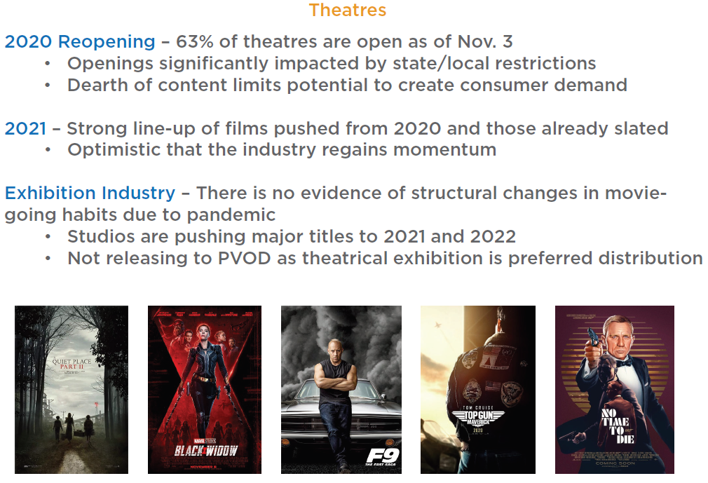 AMC나 Regal 같은 극장은 작년 11월 기준 63%가 다시 문을 열었으며 2020년에 개봉 예정이었으나 연기된 탑건이나 007 같은 작품들이 2021년에 개봉되기를 기대하고 있습니다.