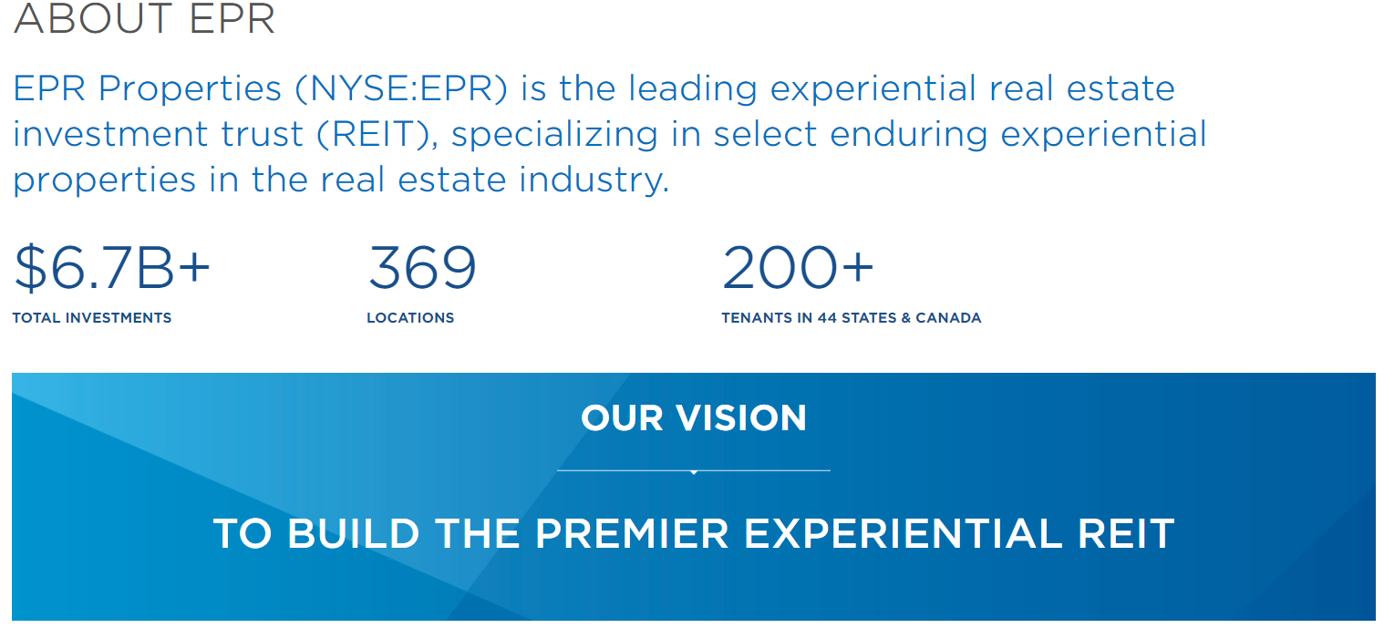 EPR Properties는 미주리 주 캔자스 시티에 있는 부동산 투자 신탁으로 1977년에 창립되었으며 직원수는 불과 62명입니다.