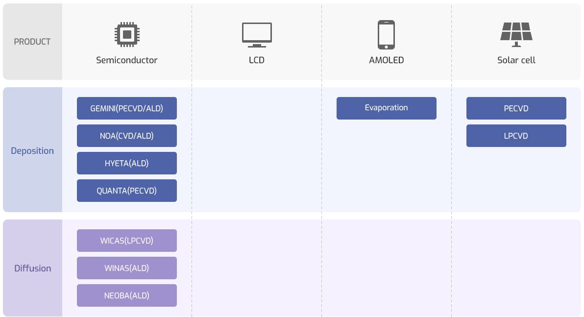 증착(Deposition) 공정, 확산(Diffusion)공정, Thermal System, 식각(Etching) 공정 등 반도체 전공정에서 사용하는 장비를 만듭니다.