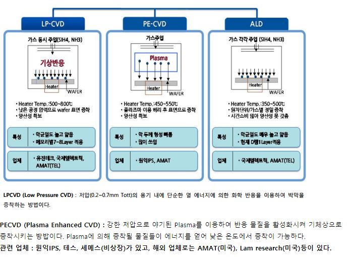 박막을 쌓는(성장) 방법은 크게 3가지 PVD, CVD(Chemical Vapor Deposition), ALD(Atomic Layer Deposition)가 있으며, 유진테크는 LP-CVD와 ALD 장비를 만듭니다.