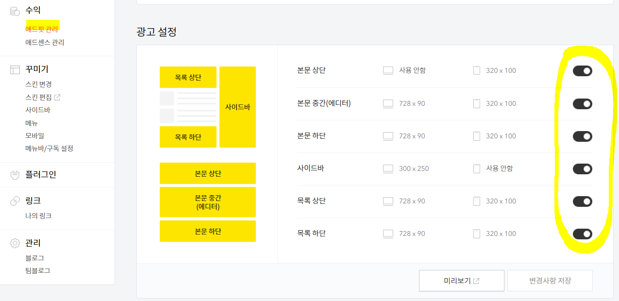 블로그 관리 홈 --> 수익 --> 애드핏관리 --> 광고위치 선택