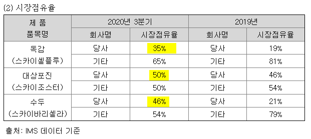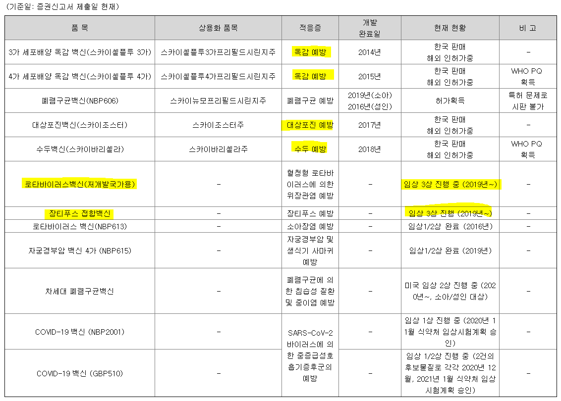 백신 주요 제품은 독감백신(스카이셀플루), 대상포진백신(스카이조스터), 수두백신(스카이바리셀라)입니다.