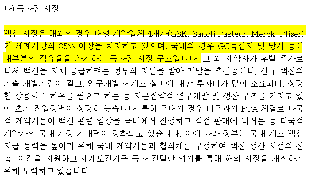 백신시장은 세계적으로 GSK, 사노피, 머크, 화이자가 장악하고 있으며, 국내에서는 GC녹십자와 SK바이오사이언스의 독과점 시장이라고 합니다.
