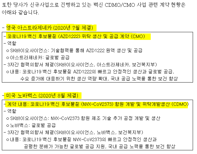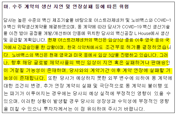 아스트라제네카의 위탁생산은 리스크가 아닌 것 같으나, 노바백스 백신은 임상 지연, 실패, 판매 거절 등의 이유로 위탁생산을 못할 수 있는 리스크가 존재합니다.