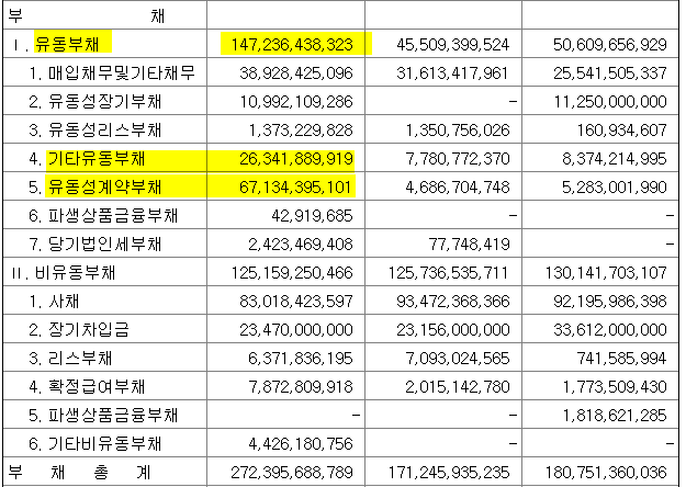 기타유동부채와 유동성계약부체가 급증했는데요, 확인이 필요해 보입니다.