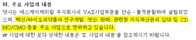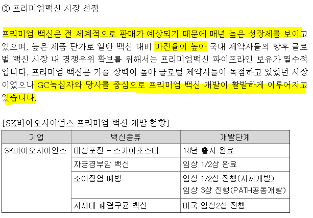 백신 제품 개발 입장에서 보면 경쟁사는 GC녹십자이고, 백신분야 CMO 경쟁사는 GC녹십자, 한미약품, 삼성 바이오로직스 인 것 같습니다.