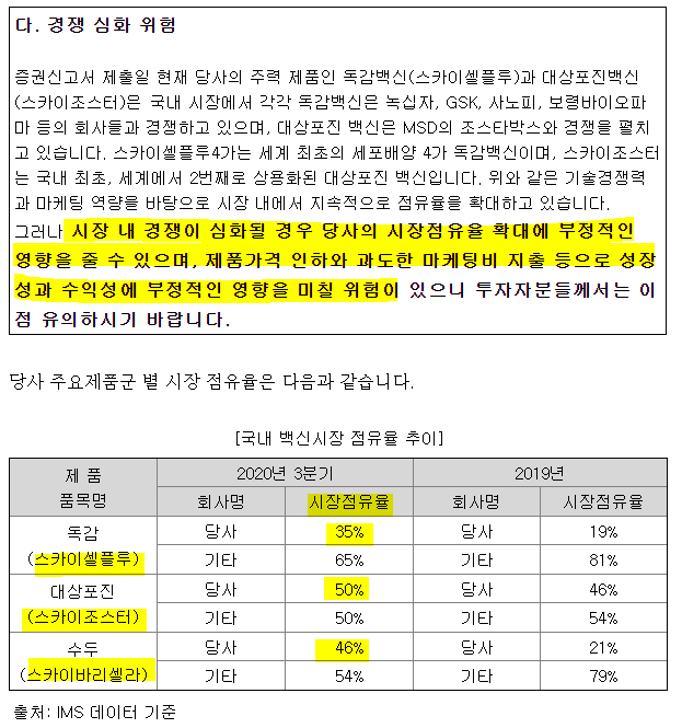 SK바이오사이언스의 주력제품은 독감백신인 스카이셀풀루, 대상포진 백신인 스카이조스터, 수두백신인 스카이바리셀라인데, 백신 성장성 둔화 및 시장 경쟁 심화에 따른 수익성 저하를 리스크로 꼽고 있습니다.