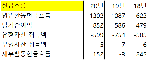 영업활동현금흐름이 최근 3년 모두 (+) 입니다.