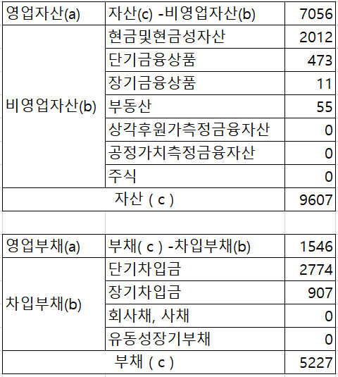 순비영업자산 = 비영업자산 - 차입부채이며 2551억 - 3681억 = -1130억입니다.