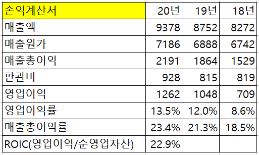 영업이익률은 10%를 넘기고 있어 준수하며 매출총이익률도 20%대로 준수합니다.