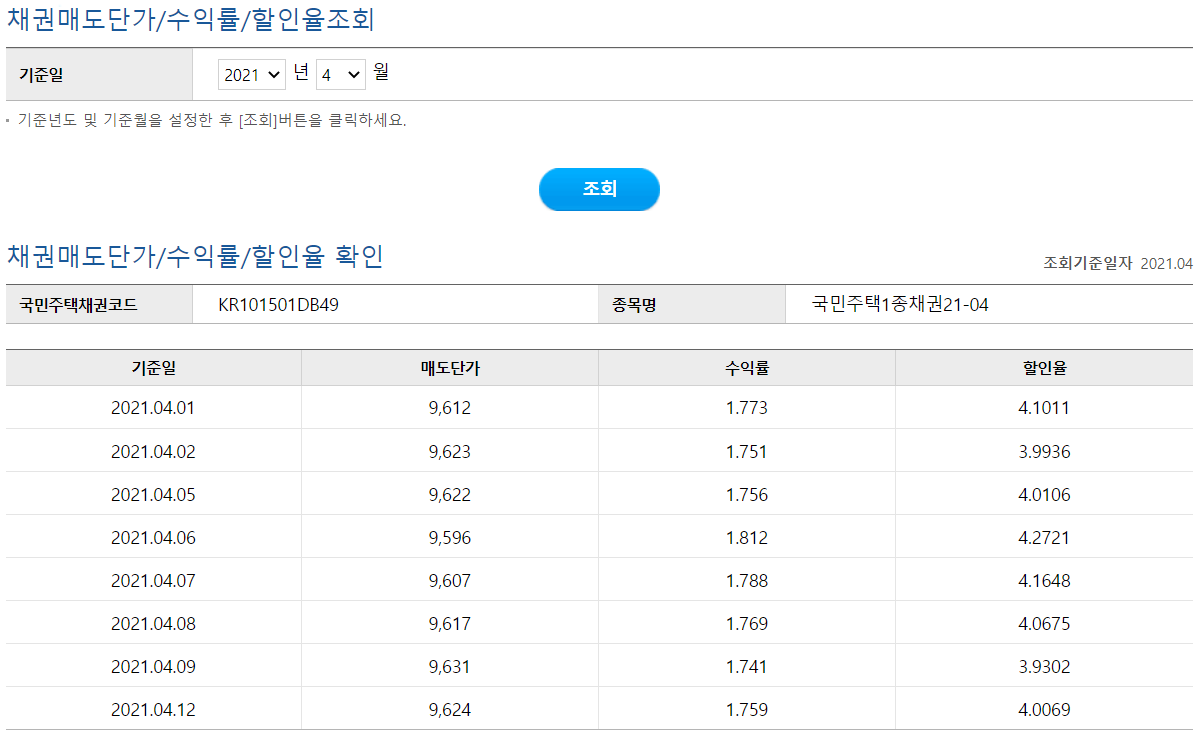 국민주택 채권 할인율은 은행 사이트에서 조회 가능합니다.