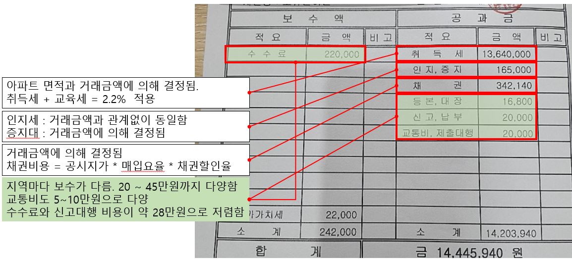 취득세, 교육세, 증지대, 인지대는 아파트 매수 가격에 근거해서 문제없이 책정된 것 같습니다.