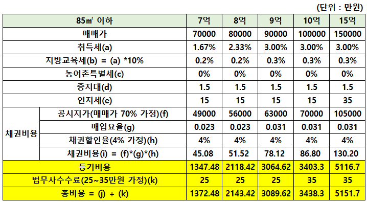 무주택자가 85㎡ 이하(34평) 크기의 2억~15억짜리 아파트를 취득한다고 가정하고 아파트 등기비용을 계산해봤습니다.