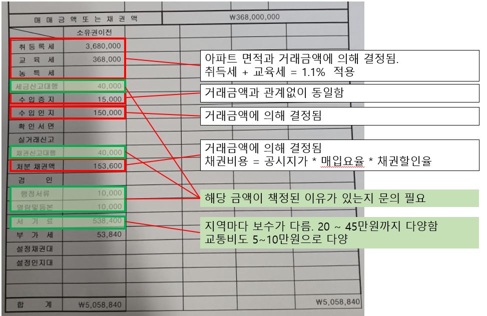취득세, 교육세, 증지대, 인지대, 채권 비용은 아파트 매수 가격에 근거해서 문제없이 책정된 것으로 추정됩니다.