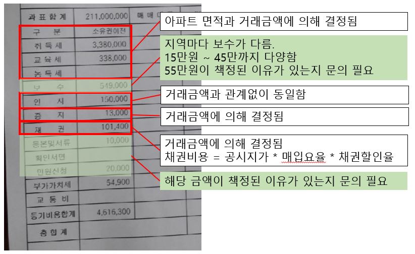 취득세, 교육세, 증지대, 인지대 는 아파트 매수 가격에 근거해서 문제없이 책정된 것 같습니다.