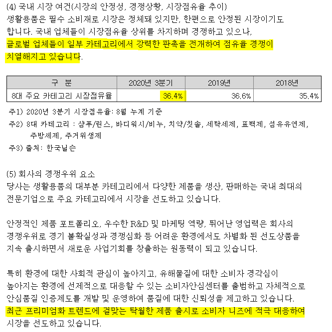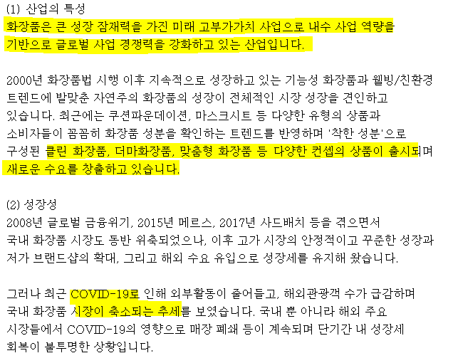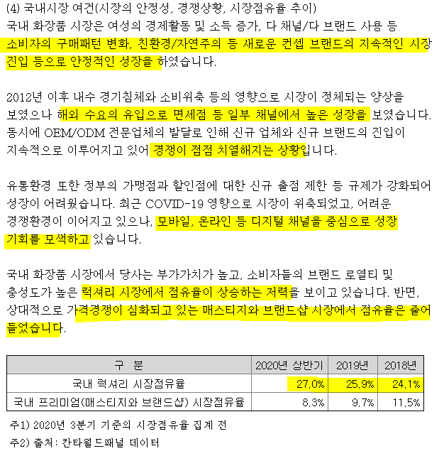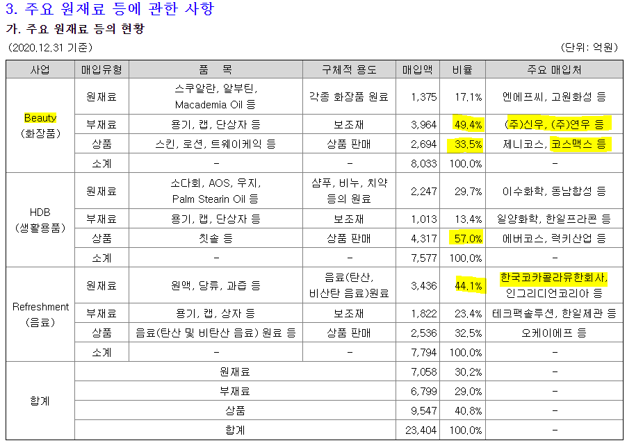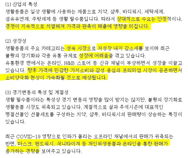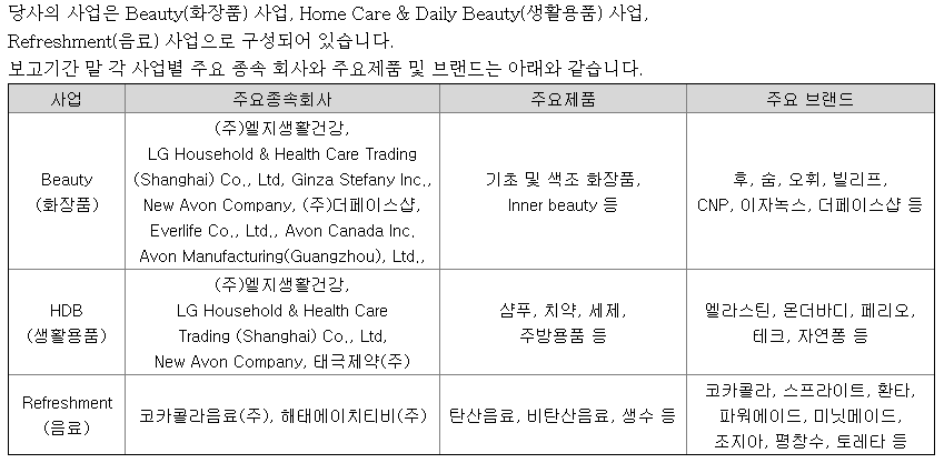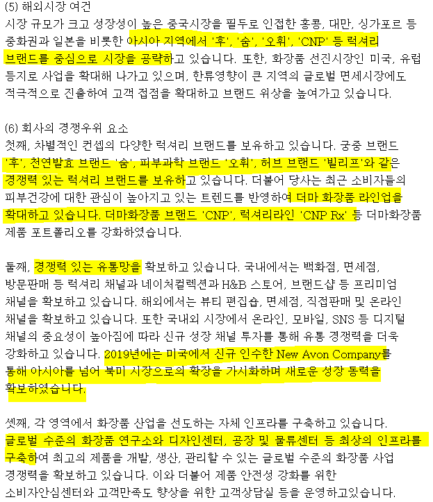 많은 종목의 사업보고서를 읽어보지는 않았지만 LG생활건강 사업보고서는 내용이 충실한 것 같습니다.