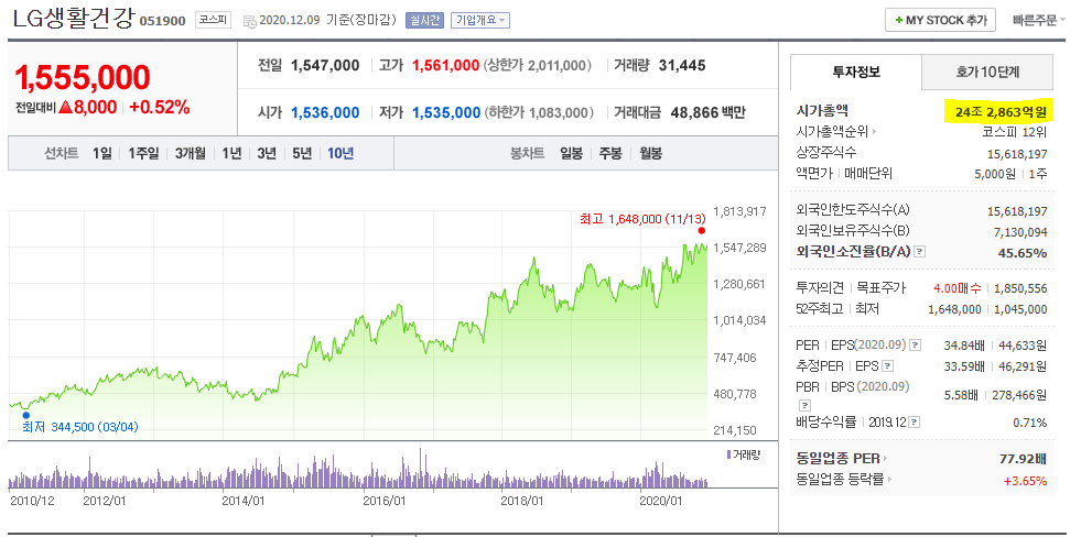 LG생활건강 주가는 10년 동안 꾸준히 상승하고 있습니다.