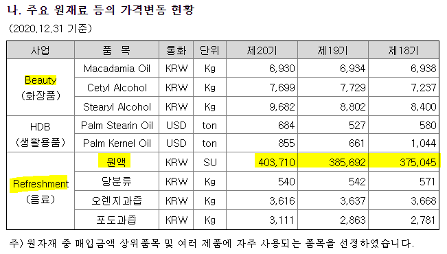 원재료 수입으로 인해 환율, 원자재 가격에 영향을 받는군요.