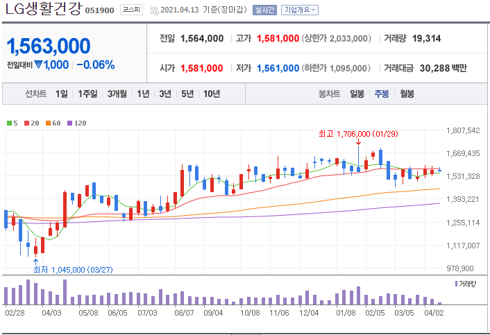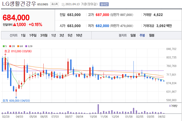 LG생활건강우의 주가는 21년 1월 중순경 78만원을 찍고 지속 하락 횡보하고 있으며 21년 4월 16일 현재 68만원입니다.