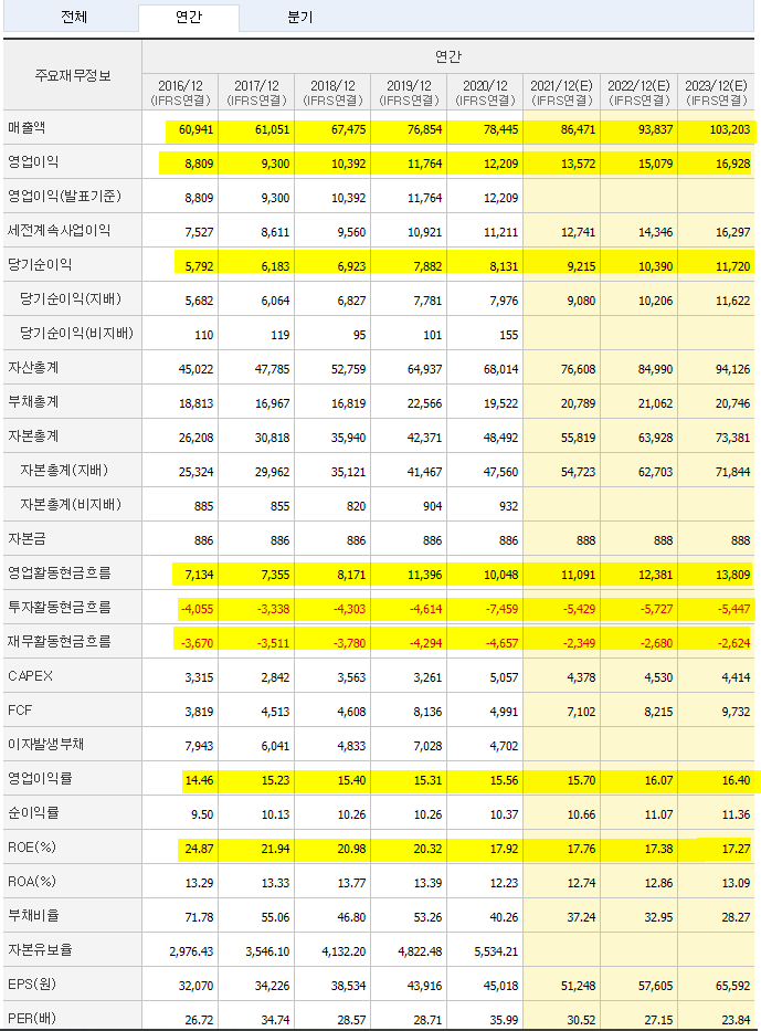 영업이익률도 15%가 넘고, ROE도 15%가 넘고..