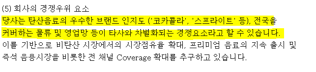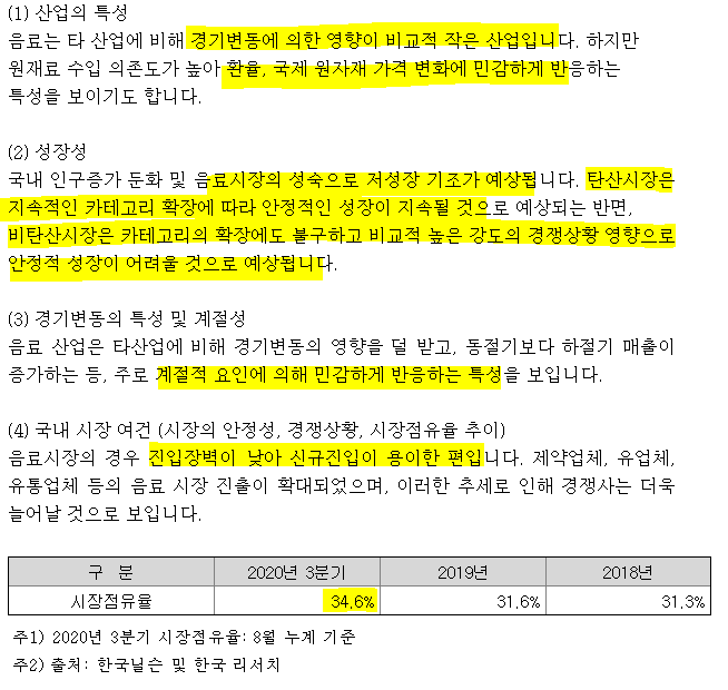 탄산시장은 안정적이지만 비탄산시장은 경쟁이 치열하다고 하네요.