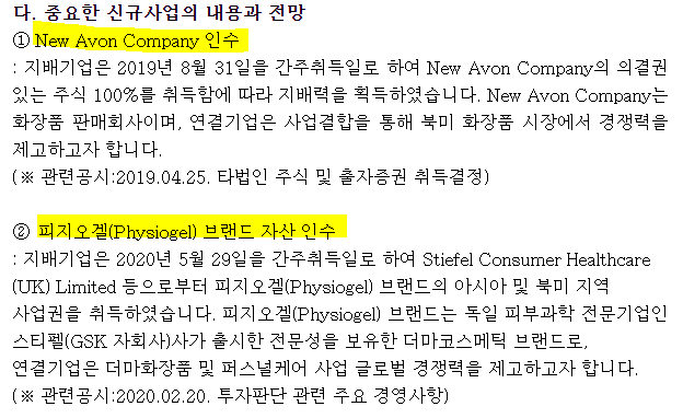 사업보고서에도 Avon 인수, 피지오겔 인수건이 보이네요.