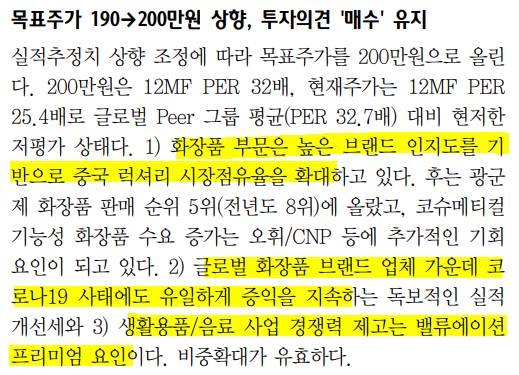 이 말은 중국에서 LG생활건강 화장품 입소문 났으니까 앞으로 돈 더 벌 거야로 들립니다.